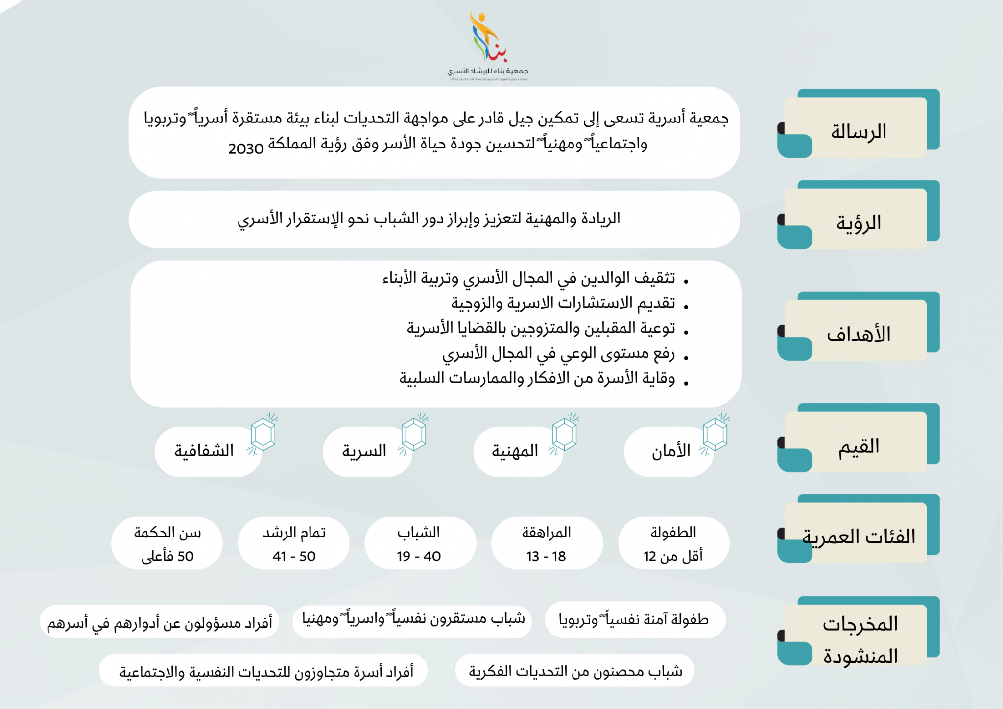 صرح جديد في سماء طيبة الطيبة انطلقنا فيه من رؤية وطننا الحبيب ٢٠٣٠ في السعي لإكساب مجتمعنا جودة الحياة. فالأسرة عبارة عن اللبنة الأولى في كيان المجتمع و هي الأساس المتين الذي يقوم عليه هذا الكيان فإذا صلح الأساس صلح البناء و من هنا كان اهتمام جمعية بناء بالأسرة لتعزيز دورها للقيام بوظائفها من خلال تأهيل أفرادها و تقديم الإرشاد لكافة فئاتها لتحقيق أمنها و استقرارها و قد تشرفت الجمعية بنخبة مباركة من المرشدين و المرشدات تميزوا في تقديم إرشادهم بأحدث الأساليب العلمية همهم الحفاظ على كيان الأسرة ليكون قوياً متماسكاً.
